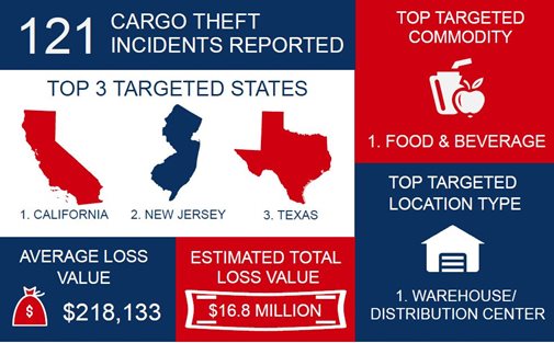 Warehouse and distribution centers in New Jersey, California and Texas are prime targets, having the highest reported incidents of theft in the U.S. The average loss of each stolen load? $218,133.