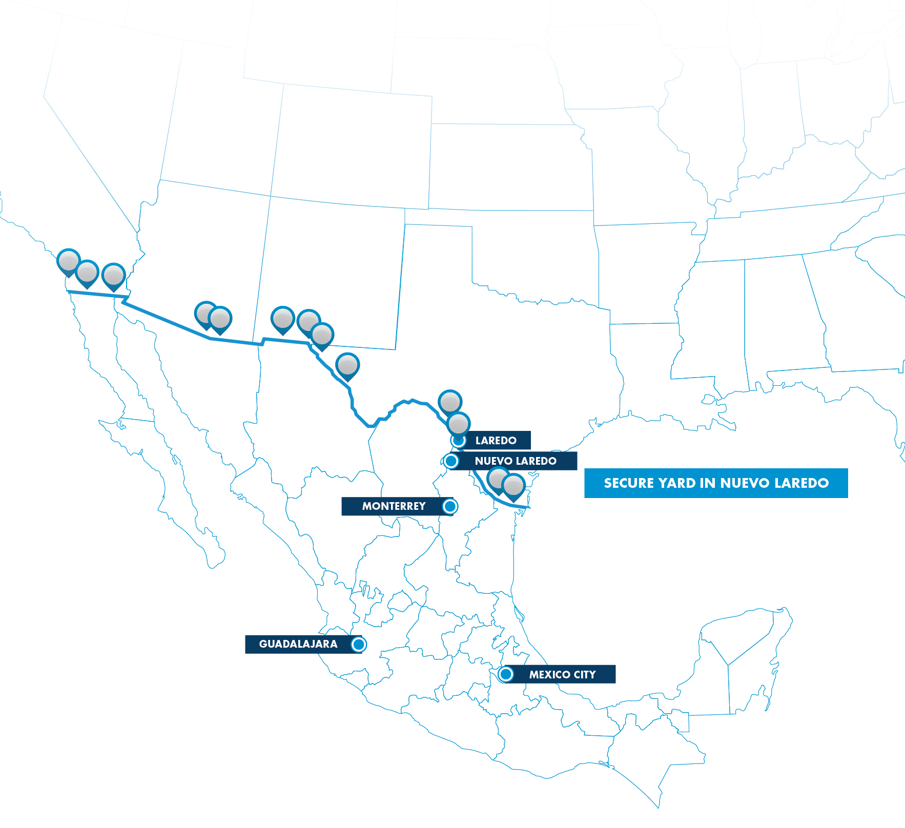 As a one stop shop, we coordinate every step through a variety of modes and services, including: TMS integrations support, allocated trailer pools staged at the border for hook and drop operations and transloading capabilities. Our warehouse network includes 25 facilities supporting northbound and southbound shipments at all major border crossings, with three strategically located in Laredo. Alongside a secure yard in Nuevo Laredo, these facilities provide specialized transloading services for high value, bonded and temperature controlled freight whether that be palletized or floor loaded. And with a dedicated TQL office right in Laredo, we're positioned at the heart of the border to keep your freight moving seamlessly.